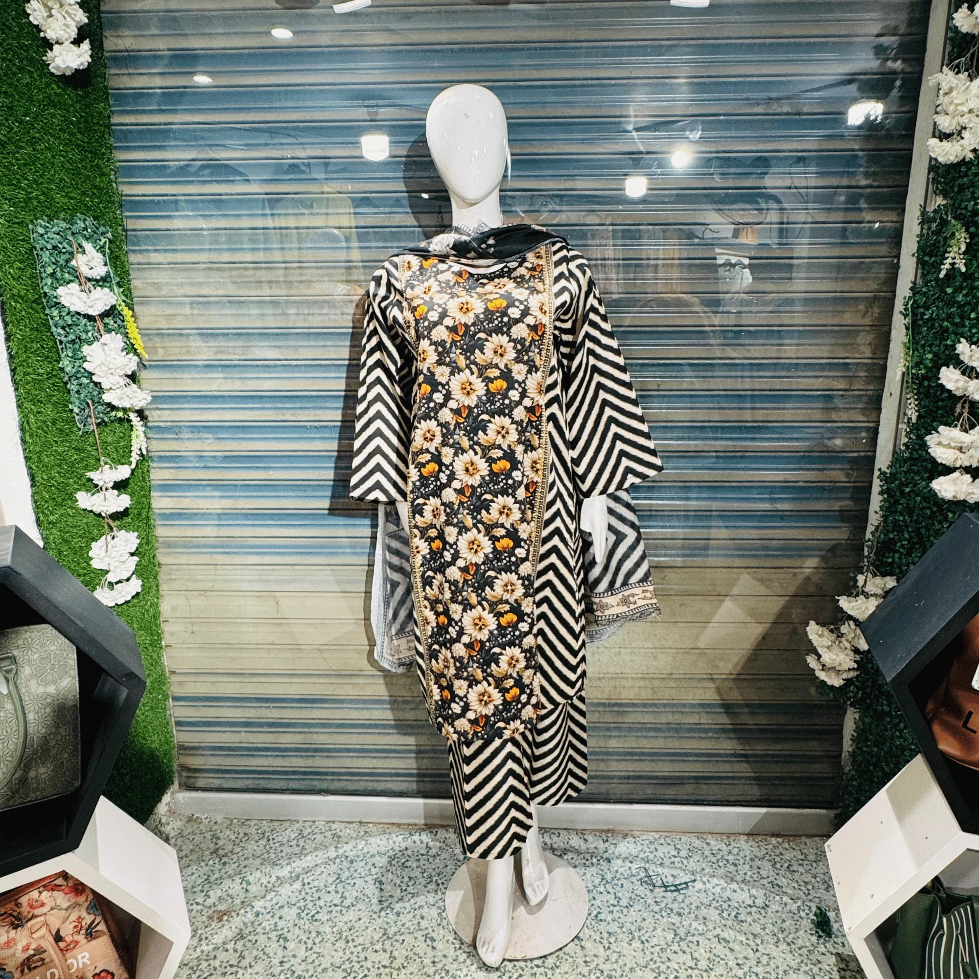 A graceful traditional outfit showcased at Ladies Icon. The ensemble includes a subtly embroidered white kurta paired with matching trousers and a sheer white dupatta adorned with elegant floral and leaf motifs. The sleeves are finished with a touch of pink at the cuffs, adding a soft contrast to the all-white outfit. Draped stylishly on a mannequin, the dress is set against a black wall decorated with artificial green leaves, enhancing the sophistication of the display. Perfect for festive or formal wear, this outfit reflects timeless charm and understated luxury.